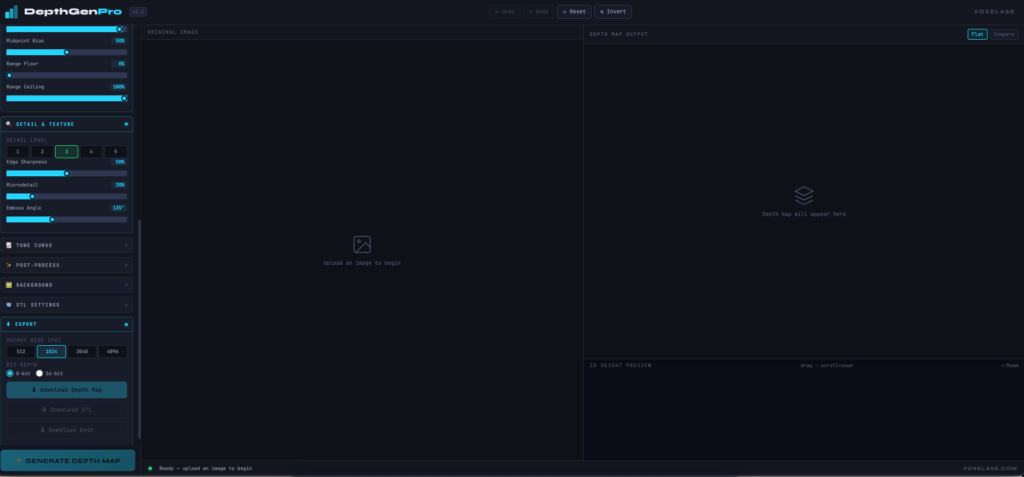 • Access to all 8 presets, 4 depth algorithms, tone curve editor, STL export, and 3D preview