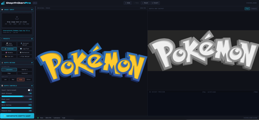 Previous depth map tools — including DepthGen’s own earlier version — applied an incorrect luminance formula. v2.1 now uses the ITU-R BT.709 standard for perceptual luminance (0.2126R + 0.7152G + 0.0722B), which is the same formula used by professional color science tools. This means your depth maps are perceptually accurate — shadows and highlights land exactly where they should for engraving.